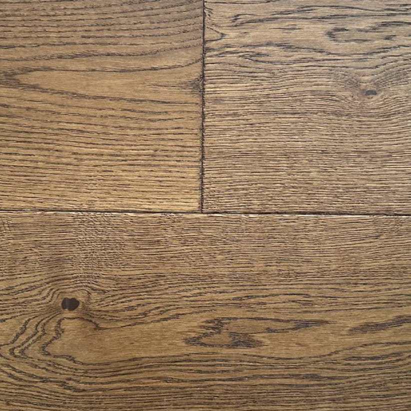 Dark, dramatic, and rich with character — Leeds is a deep, tobacco-stained white oak with bold, contrasting grain and a hand-scraped, wire-brushed texture that gives it a genuinely aged, artisanal quality. The deep shadow lines between the grain ridges create a floor with remarkable visual depth — one that looks better the closer you look.